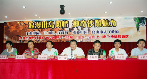 蓝天碧海,椰风帆影,6月30日,2009中国(江门)侨乡旅游节筹委会在风景秀丽的国家4X级旅游景区—上川岛飞沙滩隆重举办新闻发布会,宣告规模恢宏的首届台山川岛沙雕节将于七月揭开神秘的面纱,向国内外游客开放。