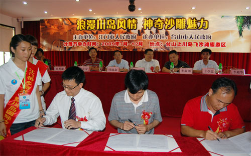 为了更好、更充分地促进客源,台山市旅游局、新思路策划机构有限公司以及江门市大方旅游国际旅行社有限公司三方就沙雕节期间的游客互动签订《合作意向书》。
