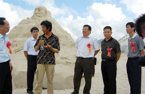 国际沙雕艺术家张永康向李崴副市长一行领导介绍沙雕情况