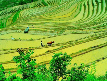 从高处望去,龙脊梯田展现了动人心魄的曲线美。 龙脊梯田始建于元朝,完工于清初,距今已有650多年历史。山脚盘绕到山顶,小山如螺,大山似塔,层层叠叠,高低错落。从高处望去,梯田的优美曲线一条条、一根根、或平行或交叉,展现了动人心魄的曲线美。春季,农民开始往梯田灌水育苗,整个梯田景区一片生机勃勃的景象。