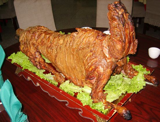 吃全羊 有煮全羊与烤全羊两种食法。煮全羊是把全羊解为几段,煮熟后,在长方形或椭圆形大木盘中按全羊形摆好,然后插上两把以上的餐刀,端到宴席上,再撤掉头和四肢。开始食用时,主人站起先用餐刀在全羊上划个“十”字,表示“请”的意思,然后,宾客各自用餐刀就近处割食。吃全羊,也叫第一道筵,过后,再上酒菜,最后上饭。