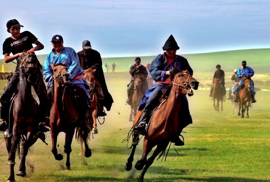 那达慕是蒙古民族在长期的游牧生活中创造的竞技项目和游艺、体育项目。据铭刻在石崖上的《成吉思汗石文》记载,那达慕起源于蒙古汗国建立初期。早在公元1206年,成吉思汗被推举为蒙古大汗时,他为检阅自己的部队,维护和分配草场,每年7-8月间举行大“忽力革台”(大聚会),将各个部落的首领召集在一起,为表示团结友谊和祈庆丰收,都要举行那达慕。起初只举行射箭、赛马或摔跤的某一项比赛。到元、明时,射箭、赛马、摔跤比赛结合一起,成为固定形式。“那达慕三艺”即摔跤、赛马、射箭。